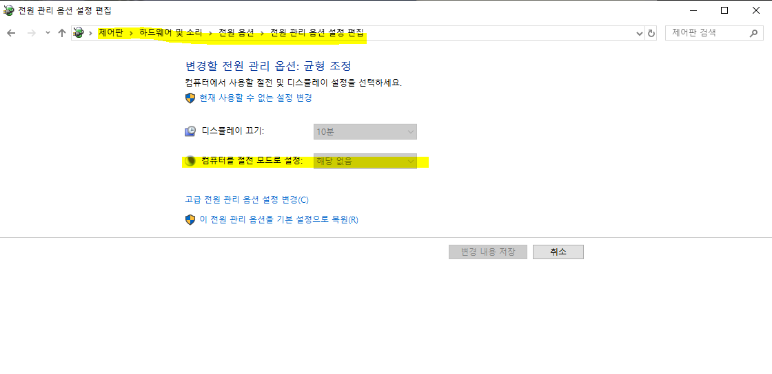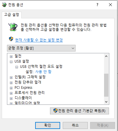 아까 페이지에서 "고급 전원 관리 옵션 설정 변경(C) 클릭"