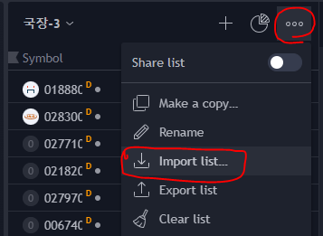 아래같이 종목 리스트 옆에 메뉴를 누르고 Import list을 누른 후에 여기에 업로드한 txt파일을 넣으면 국장-1, 국장-2 같은 리스트가 새로 생깁니다